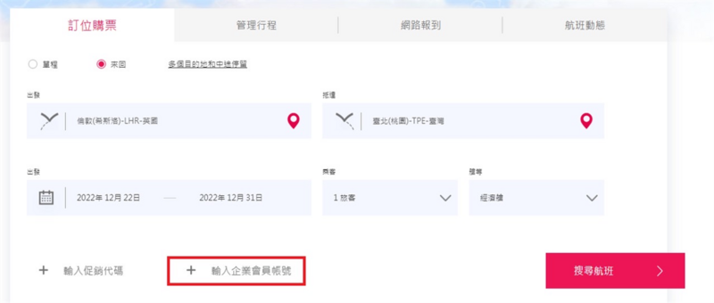 - 請進入『臺灣大學旅英校友會』專屬華航網站購票優惠,點選企業會員帳號。